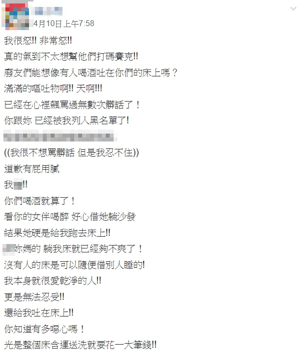 原PO在臉書《爆廢公社》淚訴,當天朋友的女伴喝醉,他好心借沙發給女子睡覺,怎料對方在沙發上躺了一會兒,轉身就跳到他的床上,接著就是一陣嘔吐,他看到原本潔淨的床上,瞬間沾上滿滿嘔吐物,理智線瞬間斷裂,飆罵「X你媽的,躺我床就已經夠不爽了!沒有人的床是可以隨便借別人睡的!我本身就很愛乾淨的人!更是無法忍受,還給我吐在床上!你知道有多噁心嗎!」