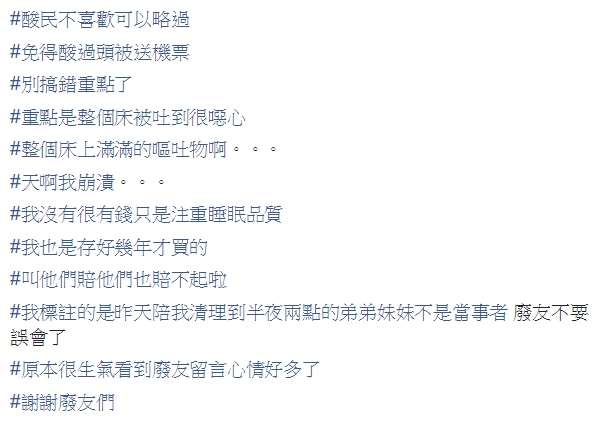 原PO透露,自己並沒有非常富有,咬牙存了很久的錢才買到那張床,當天的景象真的讓人心碎,不過朋友和女伴都沒有工作,根本付不起清潔費,他只能自認倒楣,希望女子往後要多注意自己的行為舉止,最後放話不會再跟這兩人聯絡,「能想像有人喝酒吐在你們的床上嗎?滿滿的嘔吐物啊!天啊!」