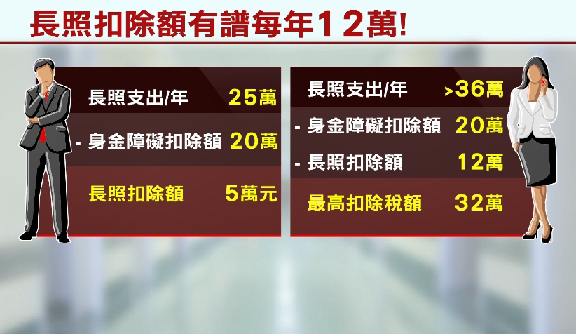 簡單換算,新制上路後,假設一年長照支出25萬,減去身心障礙扣除額的20萬元後,其餘5萬就能以長照扣除額扣除,如果一年支出超過36萬,身障扣除額20萬元,加上長照扣除額12萬元總共可以扣32萬。