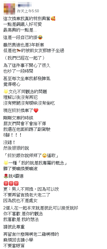 原PO在臉書《爆廢公社二館》曬出新車,表示老公開的奧迪雖然只開3年,還算是新車,但她不爽兩人交往期間,奧迪副駕駛座被對方前女友坐過,為此多次爭吵,甚至每次坐車時怒火就會湧上心頭,「我都發脾氣,覺得噁心」。