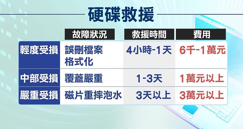 硬碟救援業者葉俊良:「屬於壞軌或是電路板損壞,大概是從8千到1萬5左右,如果是有異音或磁頭損壞,就是大概1萬3到2萬5的報價。」