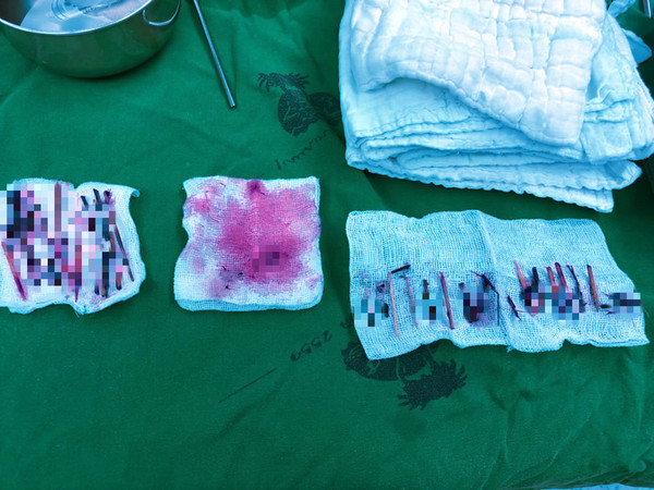 據外媒報導,泰國洛坤府西沖醫院院長日前遇到一名46歲的男病患,就醫時表示自己呼吸些微困難,經過進一步X光照檢查後,醫師竟然在他的鼻腔內發現約莫40根木材殘留物,甚至已發炎感染擴散到大腦,從鼻腔中流出發惡臭膿液。從照片中可見,長短不一、參差不齊的木條擺在紗布上,鮮血淋漓的畫面讓人看了不禁頭皮發麻。