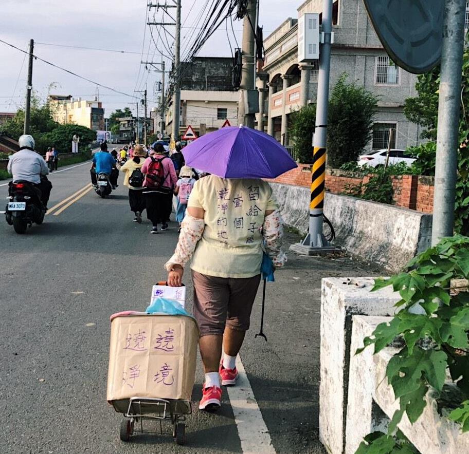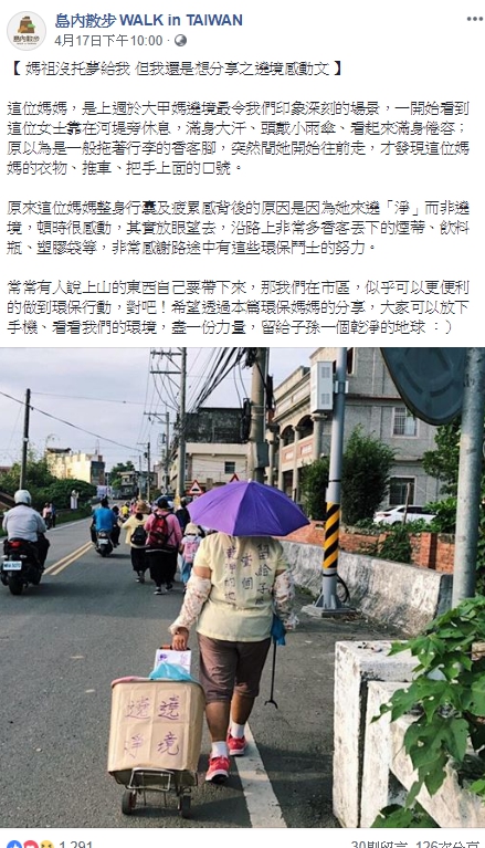 大甲媽祖遶境剛告一段落,臉書粉絲專頁「島內散步」則分享一張照片,照片裡的女士頭戴小雨傘,身穿「留給子孫壹個乾淨的地球」T恤,左手拖著一個寫著「遶境 遶淨」的箱子在路上走著,「島內散步」表示,一開始看到這位媽媽靠在河堤旁休息,看起來很疲倦,以為是一般拖著行李的香客,突然她開始往前走,才看見她身上的口號。