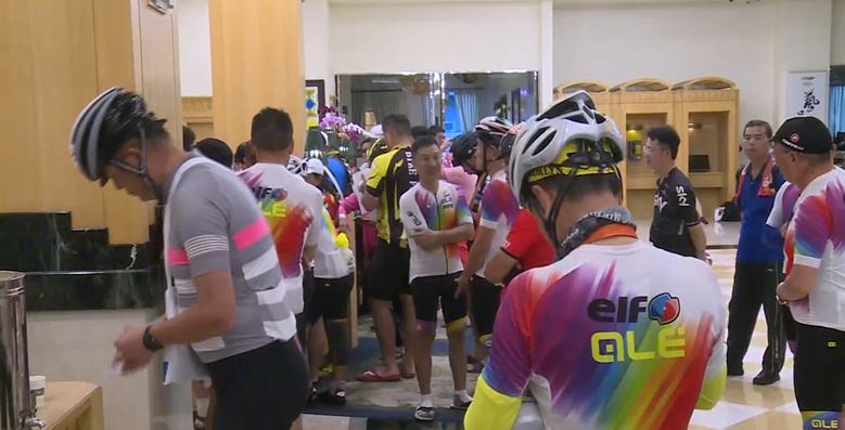 原來這群騎士是參加環花東自行車賽20號開跑,一路衝到台東,原本下午應該要到飯店休息,卻因為沒有房間只能在大廳等待。