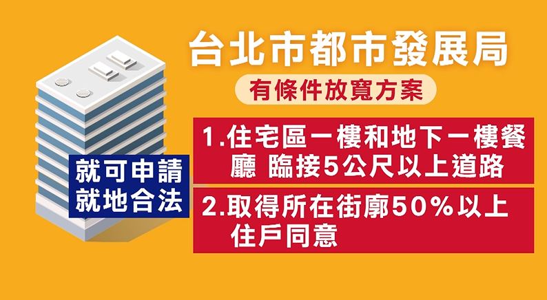 業者無奈表示,太多抗議最後也只能把店收起,幾年過去商圈逐漸沒落,為求振興台北市都市發展局,提出有條件放寬方案,位於住宅區一樓和地下一樓餐廳,只要臨接5公尺以上道路,並且取得所在街廓,50%以上住戶同意,就可申請就地合法。