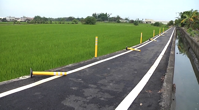 這裡是斗六市和林內鄉交界的雲72線一條農路,這幾天因為狂風暴雨,路旁的防撞桿疑似被吹倒,民眾上前一看,才發現這些用AB膠黏的防撞桿根本不防撞,質疑當初的工程品質和驗收有問題。