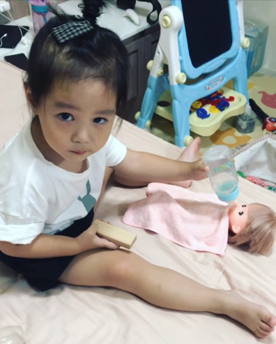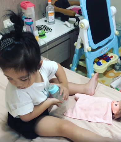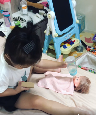 原PO在臉書「爆廢公社」曬出一段寶貝女兒的無厘頭影片,可見身穿白色短袖、頭綁著可愛小包頭的妹妹,手拿著奶瓶,就算發現媽媽正在錄影,充滿呆萌的小眼睛仍離不開前方蓋著小被被的嬰兒玩偶,神情專注地將奶瓶輕輕塞入玩偶口中,開心玩著扮家家遊戲。沒想到,接下來的動作卻讓媽媽驚呆直呼,「我覺得我女兒是在污衊我…我無法接受」。
