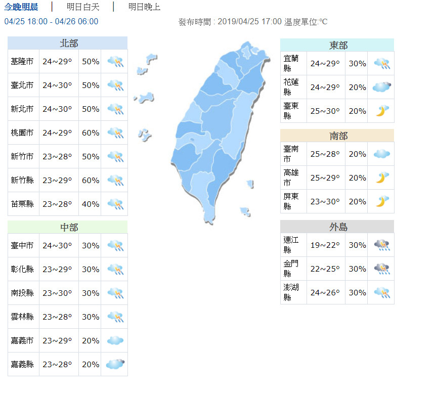 根據中央氣象局,今晚至明日鋒面通過及東北風增強,北部及東半部氣溫稍下降,西半部及東北部地區將轉為有局部短暫陣雨或雷雨,東部、東南部地區亦有局部短暫陣雨;明日東半部地區及西半部山區有局部大雨發生的機率。27日東北風影響,北部、東北部及東部天氣較涼,北部及東半部地區有局部短暫陣雨,其他地區天氣為多雲,午後有局部短暫陣雨,26日、27日東半部地區及西半部山區有局部大雨發生的機率。