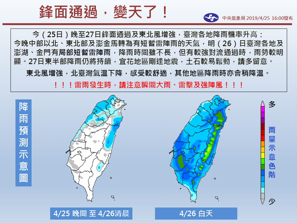 臉書「報天氣-中央氣象局」指出,今晚至27日鋒面通過及東北風增強,台灣各地降雨機率升高,今晚中部以北、東北部及澎金馬轉為有短暫雷陣雨的天氣,明日台灣各地及澎湖、金門有局部短暫雷陣雨,不過整起降雨的時間不長,比較會是一陣一陣的降雨型態,但有較強對流通過時,雨勢較明顯。27日東半部降雨仍將持續,宜花地區剛逢地震,土石較易鬆動,請多留意。東北風增強,北台灣氣溫下降,感受較舒適,其他地區降雨時亦會稍降溫。