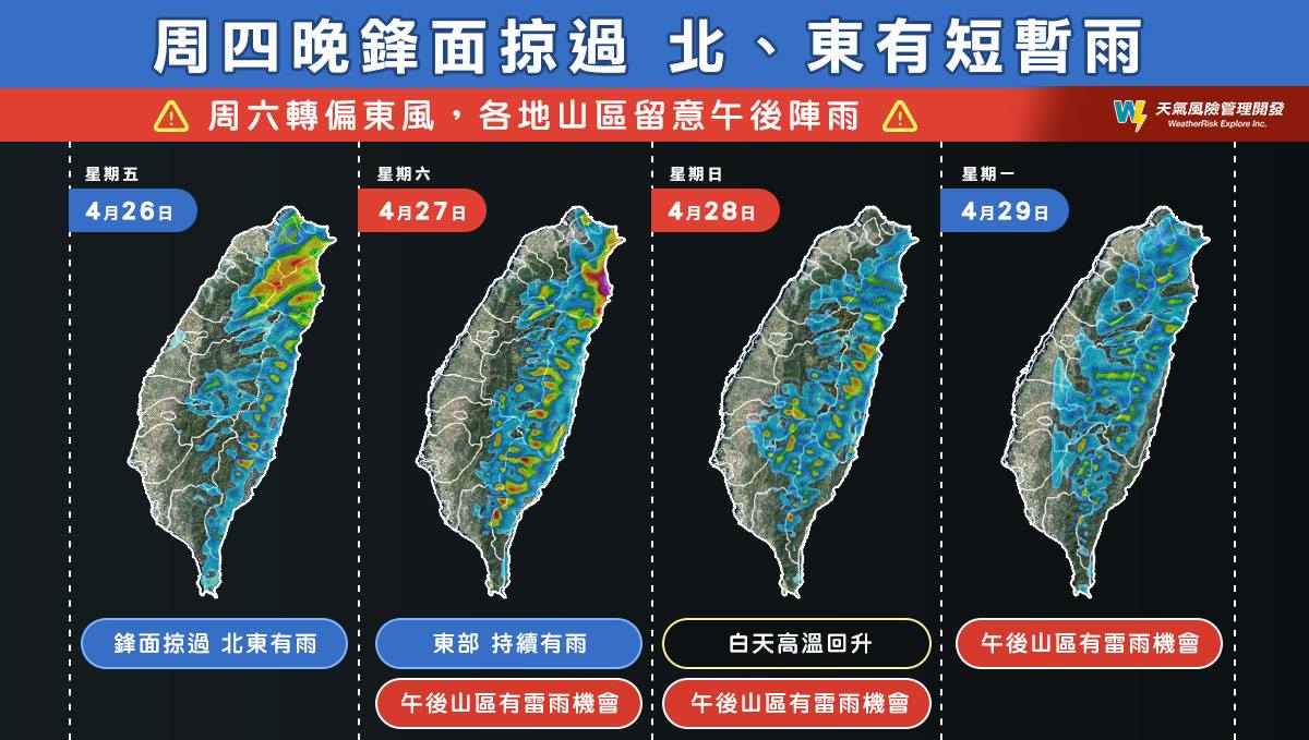 另外,臉書「天氣風險 WeatherRisk」也指出,今晚至明日微弱鋒面掠過,主要影響在北部及東部,有短暫陣雨,中南部地區維持多雲到晴天氣。有東北風南下,北部極端高溫情形緩和。週六(27日)台灣附近轉吹偏東風,北部降雨減緩,東半部仍持續有雨,各地山區留意午後陣雨。直到週日至下週一(28至29日),北部高溫又回到30度,各地山區仍需留意午後陣雨。