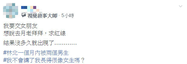 原PO想要交女友,拜了月老卻收到男性好友的告白,他一點開心的感覺都沒有,反而有些無奈,更自爆自己一個月內被2個男生告白,讓他無言以對,「我不會講了,我長得很像女生嗎?」