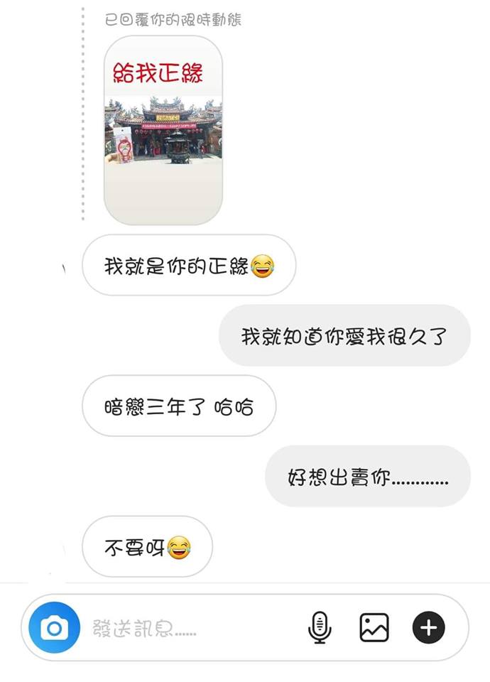 原PO在臉書《爆廢公社》發文,他因為不想再單身,決定要交女朋友,於是他今(26)日到樂成宮拜月老,順便求紅線,同時也在Instagram貼出限時動態,他還在上頭寫下「給我正緣」,希望可以找到生命中的真命天女,「結果沒多久就出現了…」說時遲那時快,他才拜拜完不久,立刻收到好友的告白,只不過對方是男的。好友表示:「我就是你的正緣」,還附上一個哭笑的表情,他見狀回覆:「我就知道你愛我很久了」,沒想到對方坦言「暗戀3年了,哈哈」,讓他哭笑不得,決定出賣他。