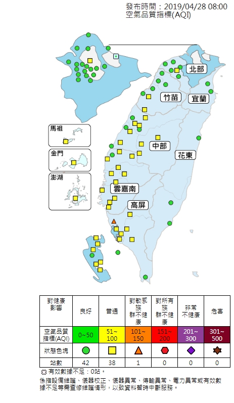 宜蘭、花東空品區及澎湖為「良好」等級;北部、竹苗空品區及馬祖、金門為「普通」等級,局部地區及時段可能達橘色提醒等級;中部、雲嘉南及高屏空品區為「橘色提醒」等級;詳查環保署網站。