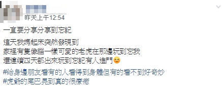 不少網友紛紛前來朝聖,目不轉睛盯著虎爺,驚呼「認真看…真的有一隻虎的感覺…是他身體消失很快剩下尾巴」、「原來是尾巴,我還以為是水管」、「感覺是真的,看到我頭暈胸口悶」、「感覺比較像貓耶,可愛」、「一開始以為是大象的鼻子」、「看到身體了, 尾巴很搶戲」、「看到了,是很大隻的虎爺,祂像貓一樣在玩」。