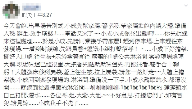 原PO在臉書《靈異公社》寫道,當天接到緊急通知趕往一處命案現場,他穿越封鎖線後,和員警、鑑識小組打招呼,接著按照程序,將擔架擺放至入口處,拿著往生被、屍袋,朝一處廢棄的公共淋浴間走去,準備案處理發現場的大體。
