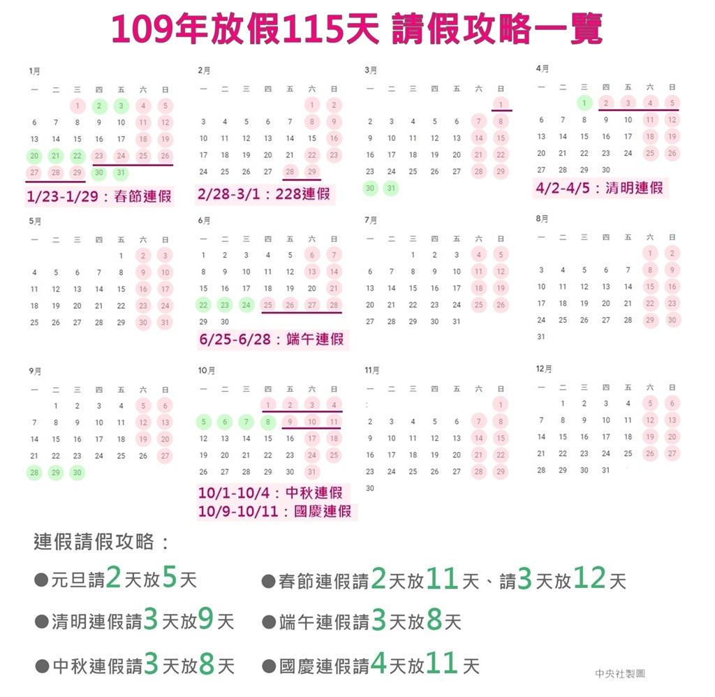 行政院長蘇貞昌4月30日核定109年政府行政機關辦公日曆表,根據人事行政總處規劃,明年放假115天,其中春節連假7天、清明節、中秋節與端午節都是連假4天。以下整理6次連假及補班日期: