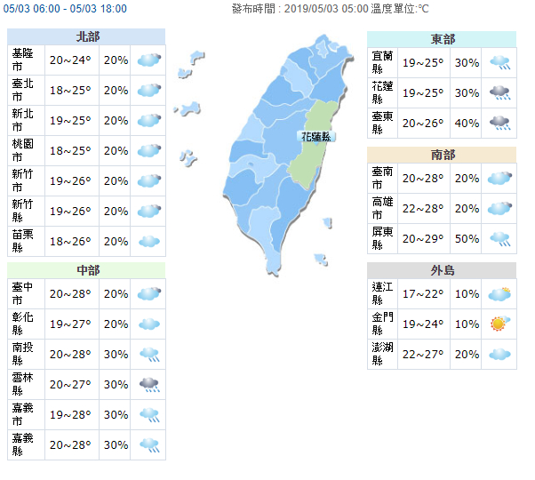 由於滯留鋒面影響,中央氣象局對6縣市發布大雨特報,臺中地區、南投地區、竹苗山區、嘉義山區及高雄山區有局部大雨發生的機率,請注意雷擊及強陣風。溫度方面,臺中以北及宜花低溫約18、19度,其他地方低溫20至23度,早起出門仍建議帶件外套,白天各地氣溫稍回升,北部及東半部高溫約24至26度,中南部27至29度。