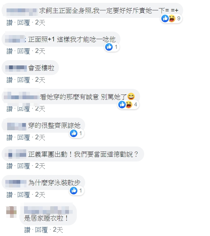 不過大多數網友全歪樓,紛紛留言求辣妹正面:「在哪裡?我去開導她」、「行為偏差,讓我用愛來教導她、糾正她」、「真想看看這種人到底長怎樣」、「可以遛飼主嗎?真的太不應該了」、「我選擇原諒」、「太可惡了,這女孩子一定是差一個男朋友幫她牽狗」、「開車騎車走路的都在看主子,狗狗當然危險啊」、「完蛋一堆要當面教訓女主角,這樣可能會沒完沒了,所以先舉辦一個初選活動,勝出的才有機會前往教育一番」,不過事實上,飼主遛狗若不牽繩是可能被罰的,根據《台北市動物保護自治條例》,寵物飼主攜帶寵物出入公共場所或公眾出入場所,應使用鍊繩、箱籠或採取其他適當防護措施,若未採取適當措施防護之寵物,得由動保處保護送交動物收容所,而違反規定者,可處新臺幣2000元以上1萬元以下罰鍰,並命限期改善, 若未在限期內改善,得按次處罰至改善為止。