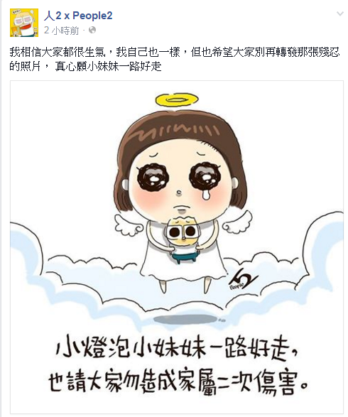 幾小時後,「人2xPeople2」貼出另一張插圖,寫著「我相信大家都很生氣,我自己也一樣,但也希望大家別再轉發那張殘忍的照片, 真心願小妹妹一路好走」。同樣附上一張可愛插圖,祝願小妹妹一路好走。