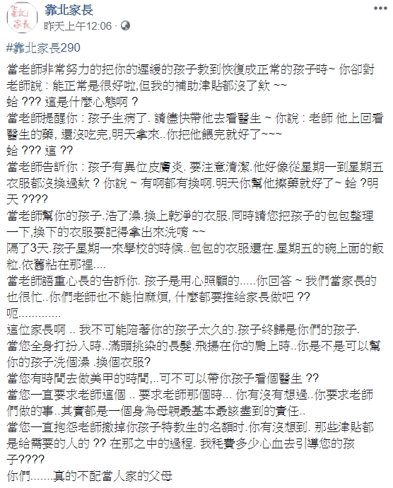媽媽的態度讓原Po感到憤怒卻也無可奈何,只好無力地喊話:「我不可能陪著妳的孩子太久,孩子終歸是你們的孩子,當您全身打扮時髦、滿頭挑染的長髮飛揚在肩上時,是不是可以幫你的孩子洗個澡、換個衣服?當您有時間去做美甲,可不可以帶孩子看個醫生?當您一直要求老師這個、要求老師那個,妳有沒有想過,妳要求老師們做的事,其實都是一個身為母親最基本最該盡到的責任?當您一直抱怨老師撤掉妳孩子特教生的名額時,有沒有想到,那些津貼都是給需要的人的?有沒有想過在那之中的過程,我秏費多少心血去引導您的孩子?」