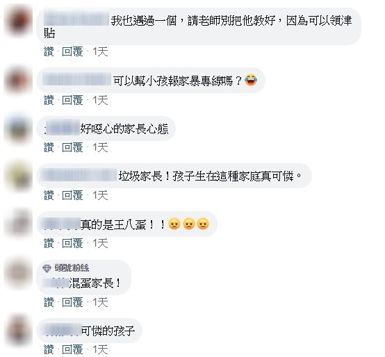 貼文曝光後,網友紛紛痛批:「疏忽照顧也是家暴的一種」、「這種人當什麼母親啊」、「打給警察比較快」、「我也遇過一個,請老師別把他教好,因為可以領津貼」、「可以幫小孩報家暴專線嗎」、「好噁心的家長心態」、「垃圾家長!孩子生在這種家庭真可憐」、「混蛋家長」。
