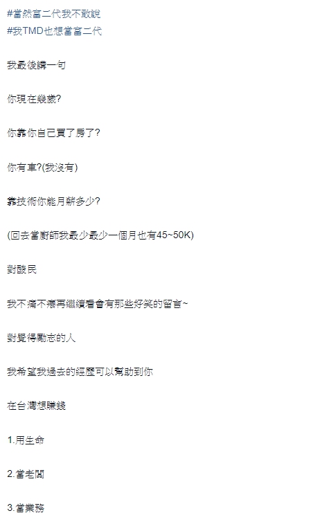 不過,也有網友說:「你除了賺錢,什麼都沒了,這算勵志?你是人不是機器」、「如果我也可以不用給家裡,家裡還可以白吃白喝白住,每個人都能買房啊」、「然後就沒朋友了」、「家裡有錢什麼都不難」、「只有收入沒有支出?吃家裡、住家裡、用家裡,卻沒給家裡一分錢」、「所以基本上就是靠家裡吃穿嘛」、「兼好幾份差,人生感覺只剩下工作」。