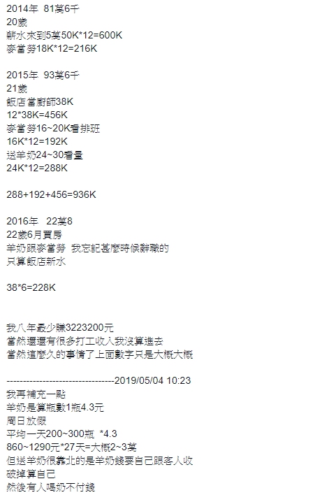 一名男網友在臉書社團《爆廢公社》中發文指出,他從14歲那年開始工作,為了開源,同時兼了3份工,凌晨3點到6點送羊奶,下午1點到9點在飯店當廚師,晚上11點到凌晨兩點到麥當勞上打烊班,而節流部分,則是住家裡、吃公司,就這樣邊賺邊存,到了22歲時已經有一筆積蓄,於是在桃園市龍潭買下一棟700萬元房子,頭期款則付了200萬元。