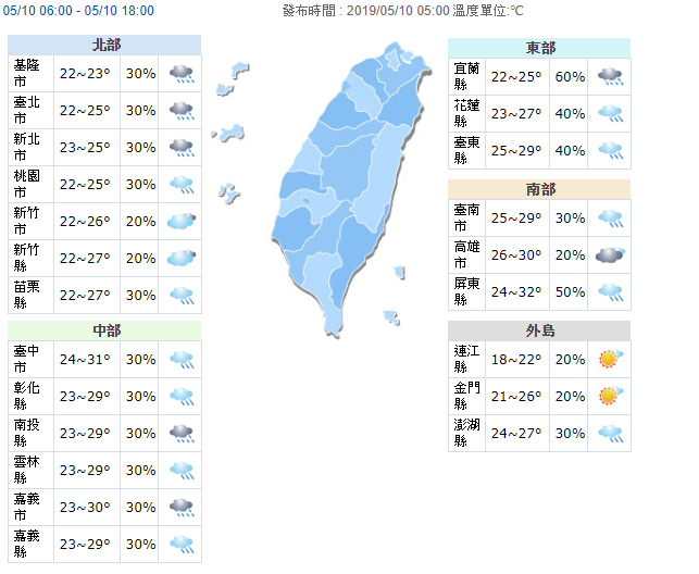 至於母親節是否將回歸好天氣,氣象局指出,週六、週日(11日、12日)水氣減少、天氣回穩,南部及東半部地區則仍有局部短暫陣雨,其他地區為多雲到晴,午後山區有局部短暫雷陣雨,氣溫持續回升,西半部高溫約30到32度,東半部也有28到30度。