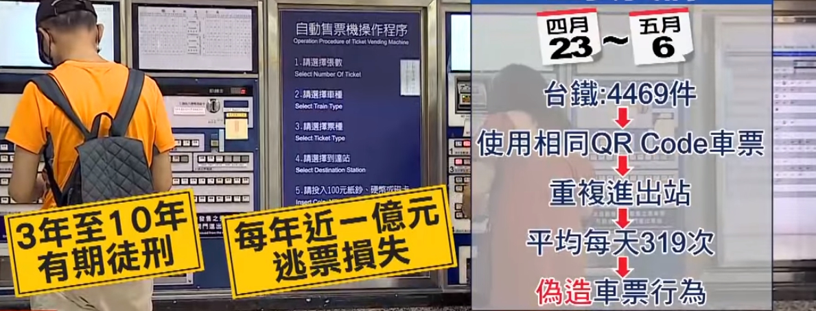 有立委質詢時表示,從今年4/23到5/6,台鐵一共有4469件,使用相同QR Code車票,重複進出站,平均每天有319次,這種行為屬於「偽造」車票行為,可處3年到10年有期徒刑,而且根據統計,每年有將近1億元逃票損失,要求台鐵必須解決,台鐵局解釋,目前多數重複刷QR Code車票,是刷票進站時,不確定是否刷成功,馬上重複再刷,不見得是逃票,同時從今年6月30號開始,將比照高鐵QR Code車票,只要有一個進站紀錄,就無法再度進站,列車長也會積極查票,預防類似逃票事件再次發生。
