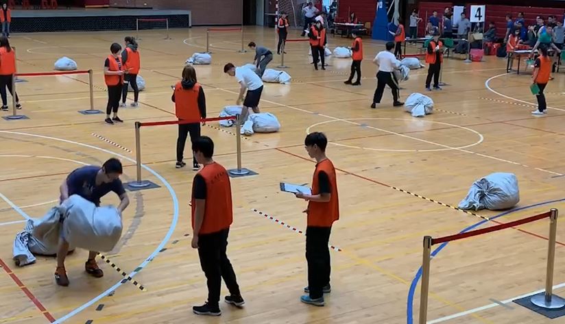 ▼扛著30公斤郵包折返跑,1分鐘完成14趟才能得到滿分。(圖/東森新聞)