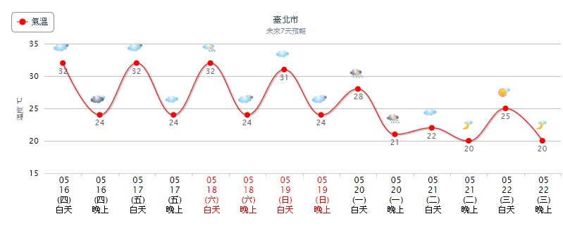 中央氣象局預報,週五(17日)將有一道鋒面通過,全台都有局部陣雨,加上午後熱力作用強,各地山區、平地都可能出現明顯且全面的明顯且全面的午後雷陣雨。週五(18日)鋒面遠離,暖熱西南風又來,水氣依然偏多,各地仍有雷陣雨,持續時間也長。這道鋒面離開後,週日至下週二(19日至21日),又有另一道結構更完整的鋒面報到,屆時全台天氣轉為不穩定,降雨機率大大提高,西北部、東北部降雨時間較長,還有局部大雨發生的機率。