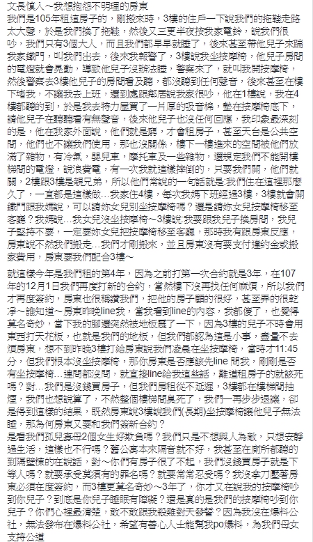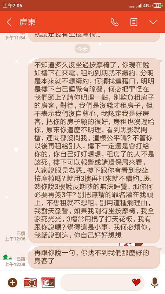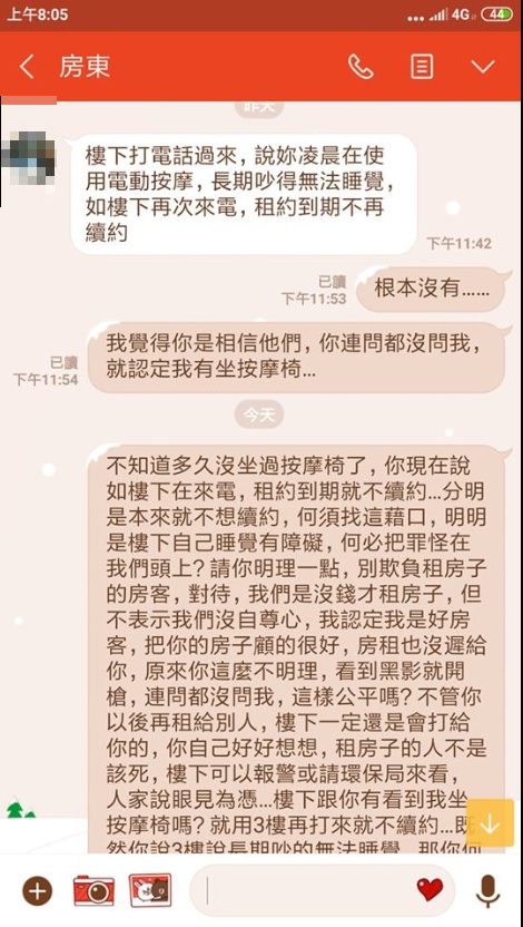「我都傻了!」房東突然傳訊息給原PO, 表示樓下住戶反應她在凌晨使用電動按摩,導致對方長期無法好好入眠,更直言若是住戶再次抗議,租約到期後就不再租給原PO。她認為自己被扣上莫須有的罪名,認為房東都沒有先確認,就單方面聽樓下住戶的說詞,讓原PO大怒「難道租房子的就該死嗎?對…我們是沒錢買房子,但我們房租從不延遲,3樓都在樓梯間抽煙,我們也想說算了,不然整個樓梯間臭死了,我們一再步步退讓,卻是得到這樣的結果…」。