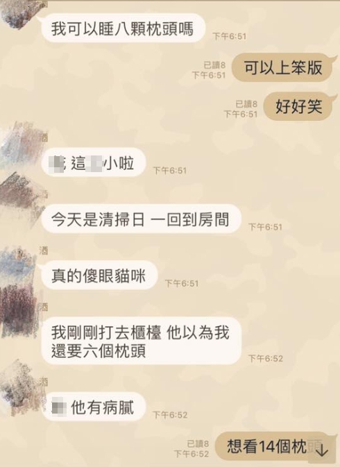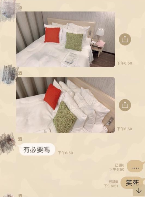原PO的朋友隨後立馬傳照片,仔細一看,床上除了有6顆白色的枕頭,還有2顆小的方形靠枕,分別為橘色和綠色,朋友無奈地嘶吼:「有必要嗎?我可以睡8顆枕頭嗎?真的傻眼貓咪」,朋友眼看再這樣下去也不是辦法,因此,決定打電話到櫃檯溝通,想要歸還多餘的枕頭,怎料,櫃檯再度誤會,「他以為我還要6顆枕頭」,讓原PO捧腹大笑「想看14個枕頭!」