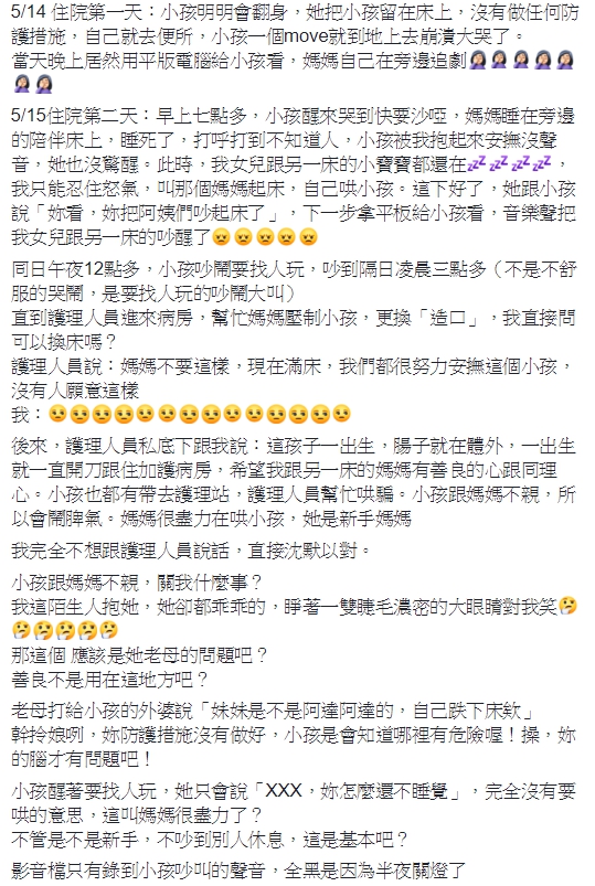 到了凌晨12點多,女嬰吵著要找人玩,一路鬧到凌晨3點多,然而,新手媽都沒有作為,原PO似乎已經忍無可忍,氣得向護理人員反映,孰料,護理人員卻解釋,女嬰出生腸子就在體外,一出生就一直開刀跟住加護病房,「希望我跟另一床的媽媽有善良的心跟同理心」,護理人員甚至還說女嬰跟新手媽不親,所以才會鬧脾氣,但對原PO來說這都是藉口。