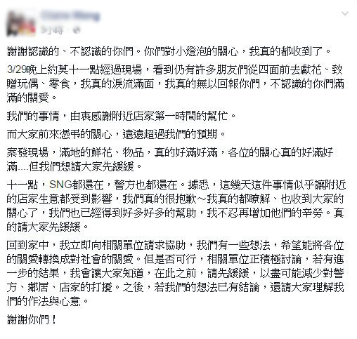 還表示晚上11點,媒體的SNG車都還在,警察也還在現場維持秩序,聽說影響到附近店家生意,小燈泡媽媽說「我們也已經得到好多好多的幫助,我不忍再增加他們的辛勞。真的請大家先緩緩。」
