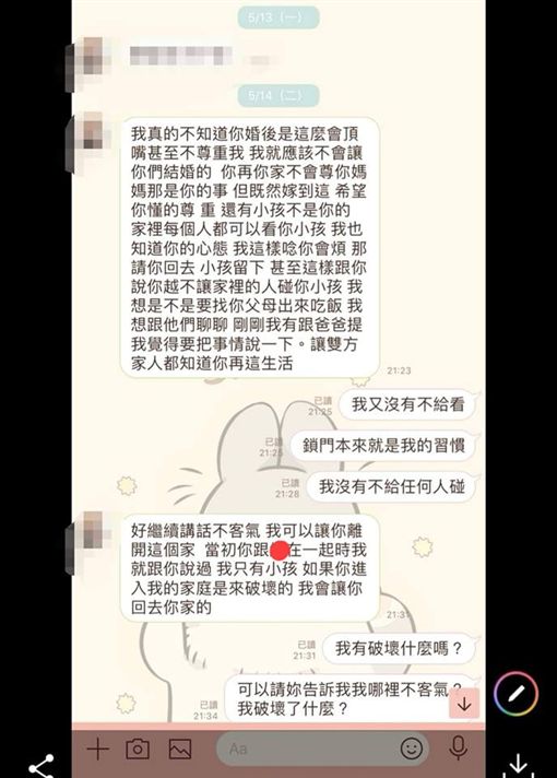 媳婦忍無可忍地說,「鎖門本來就是我的習慣,我沒有不給任何人碰(孩子)」,但婆婆似乎完全聽不進去,「當初妳跟X在一起時我就跟妳說過『我只有(要)小孩』」,更直言媳婦破壞她的家庭,「我會讓妳回去妳家的」,讓媳婦十分無奈,卻又不知道該怎麼辦。