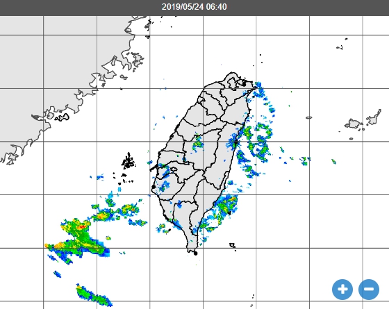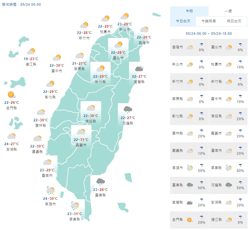 今天(24)日臺灣附近水氣仍多,風向將由偏東轉為東南風,東半部地區不時會有局部短暫陣雨,而西半部則大多為多雲到晴,局部地區午後會有短暫雷陣雨,其中在中部以北偏向於山區及近山區平地。而南部除山區外,大部分的平地也都有機會出現午後雷雨,特別是各地山區及南部地區午後會有局部大雨發生的機率,外出活動請多留意天氣變化。溫度方面,中南部高溫約30、31度,其他地方則在27、28度,中午前後天氣悶熱,請多補充水分。