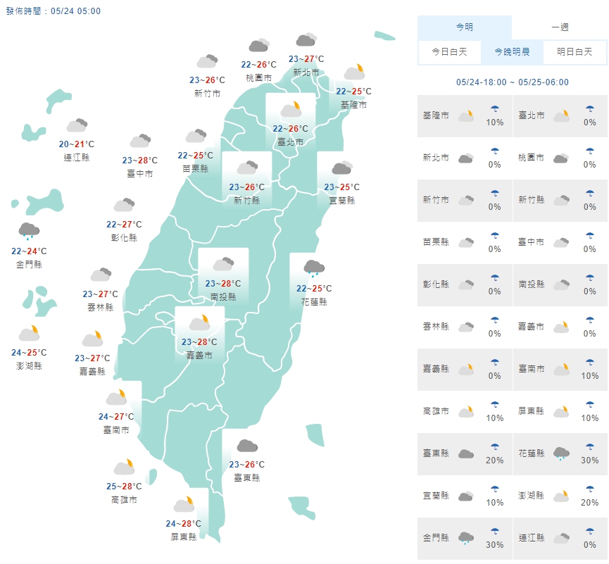 ▼24日晚上天氣預報。(圖/中央氣象局)