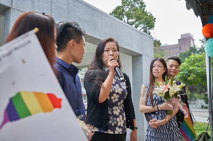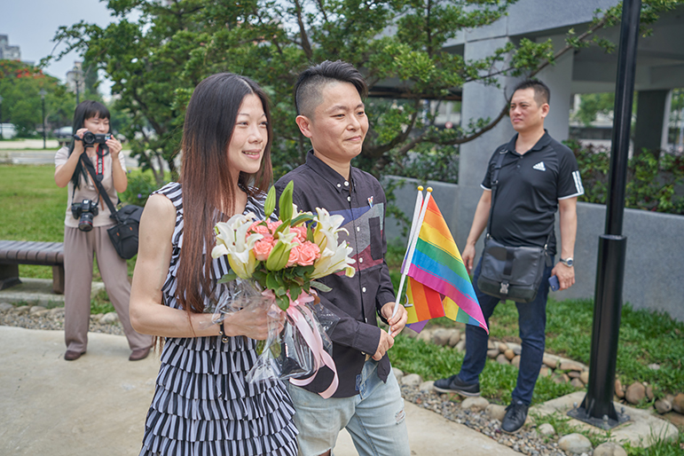 民政處張力可處長指出,今天參與的兩對同性伴侶新人中,其中翊廷與佩茹恰巧相識於4年前的5月24日,翊廷表示,每年的生日願望就是希望有一天臺灣能夠認同同性婚姻,幸運的是,2人在交往過程中,並未受到太大的阻礙,更開心能擁有彼此親友的認同與支持,更加深彼此相守一生的決心, 2人決定把這個值得慶祝的日子當作結婚紀念日,一圓多年來的生日願望。「謝謝你們為我們做這麼多!」另一對新人王凡與曉盈也感性發言,感謝在場民眾與市府團隊的祝福,她們說,2人從國小就認識,自19歲時開始交往,經過20餘年的相知相守,即便剛開始遇到一些挫折,終於在今日修成正果,也感謝市府舉辦結婚派對支持,期盼所有人都能歡喜的迎接這份得來不易的愛情果實。
