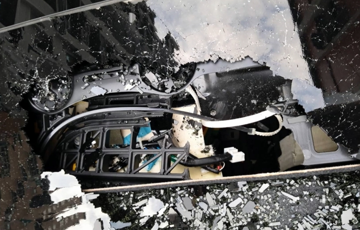 車頂天窗玻璃破個大洞,女兒的安全座椅下出現一個榔頭,距離女兒只差5公分,車內玻璃碎片不僅噴了滿地,也彈到女兒,媽媽迅速把孩子抱出車外,所幸沒有大礙,但怎麼會掉下來,時間往回推,就是這座工地,24日傍晚五點多,休旅車一經過新北市板橋的豪宅工地,卻天降榔頭砸中休旅車,差點就砸到幼稚園女童,當時工地人員聽見聲音,出來查看也著急上前關心。