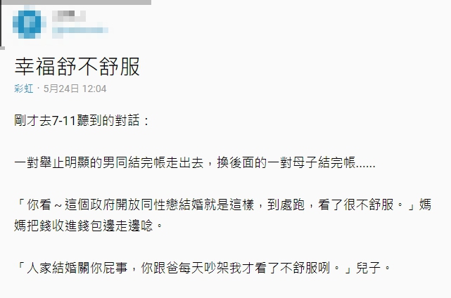 同婚專法17日三讀通過,台灣同時也成為亞洲第一個同婚合法化的國家,給予許多同志一個家!近日有名男網友到便利商店,看到一對男同志結完帳後,後方一位媽媽竟脫口而出地批評同志「到處跑,看了很不舒服」,不禮貌的言詞引起兒子23字的反駁,讓不少人忍不住豎起大拇指,「還好小孩在這樣的家庭長大沒有長歪了」。