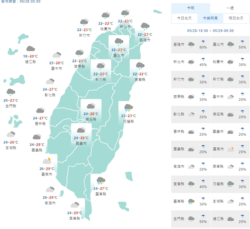 今、明(28日、29日)兩天鋒面通過及東北風增強,北部及東北部天氣轉涼,今日臺灣西半部、東北部、東部地區及金門、馬祖有短暫陣雨或雷雨,其他地區亦有局部短暫陣雨或雷雨,明日中南部及東半部地區有局部短暫陣雨或雷雨,北部地區及金門亦有局部短暫陣雨,其他地區為多雲的天氣,鋒面影響期間有局部大雨發生的機率。