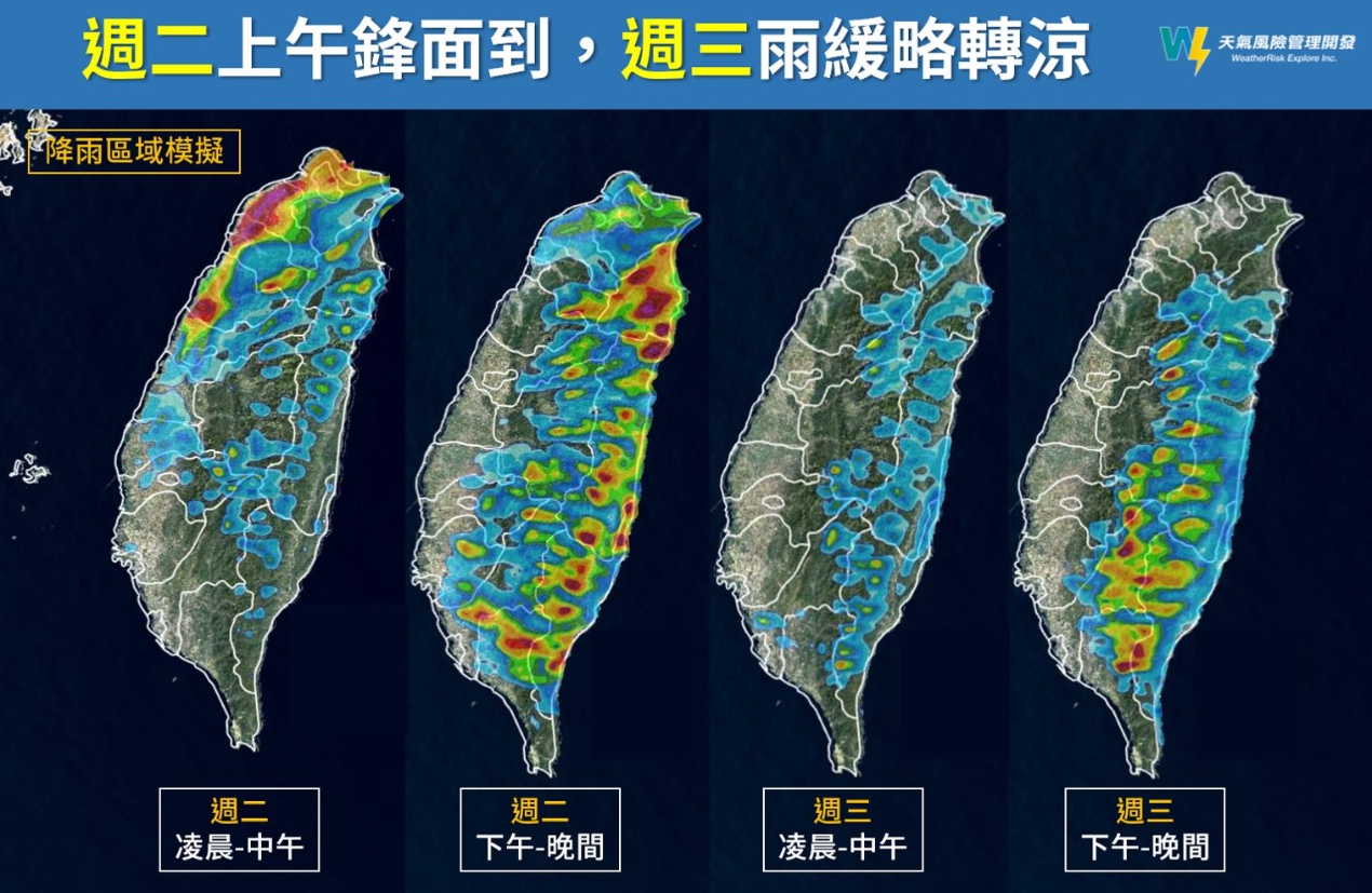另外,鋒面上有中尺度系統發展的可能性,受降雨及東北風影響,北部及東北部天氣轉涼;預測北部及東北部白天高溫約25度,中南部仍達30度以上,花東約28度、29度,而各地低溫,北部及東北部約22度,其他地區約23至25度。