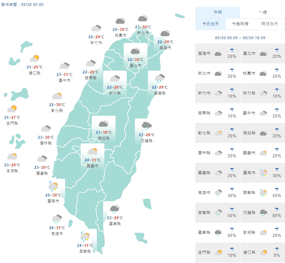 今(30)日鋒面在巴士海峽,臺灣南部及東半部地區有局部短暫陣雨,其他地區及澎湖、金門、馬祖為多雲,午後中部以北山區有局部短暫雷陣雨。今、明兩天午後皆易有局部較大雨勢發生。