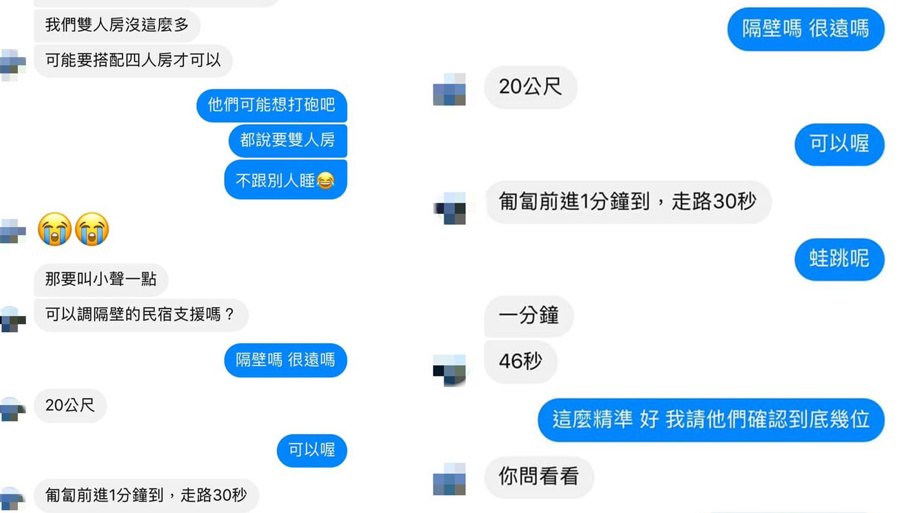 從原PO上傳的對話截圖中可見,老闆先透露民宿雙人房數量不夠,可能要搭配四人房才行,一見到原PO笑說「他們可能想打X吧,都說要雙人房,不跟別人睡」,接著更幽默回「那要叫小聲一點」,後來被問到2間民宿距離多遠時,更神回「20公尺」、「匍匐前進1分鐘到,走路30秒」。