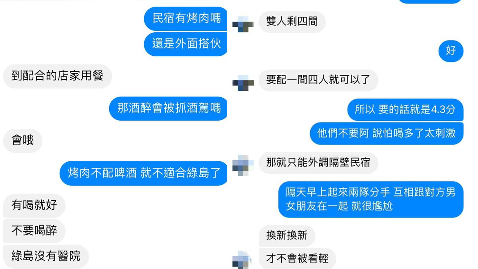這一系列對話曝光後,掀起網友熱烈討論,但不少人更被接下來的對話笑到肚子痛,因為倆人後來又回到房型問題時,老闆表示,雙人房數量不夠,可能要配一間四人房,原PO則回,「怕喝多了太刺激,隔天早上起來兩對分手,互相跟對方男女朋友在一起,就很尷尬」,未料老闆則笑喊,「換新換新,才不會被看輕」。