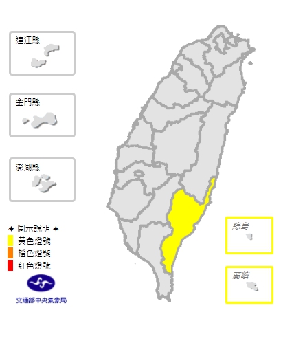 中央氣象局今天預報,明天受西南風沉降影響,東南部易有焚風,台東縣高溫可能上看攝氏36度,氣象局發布台東高溫黃色燈號。