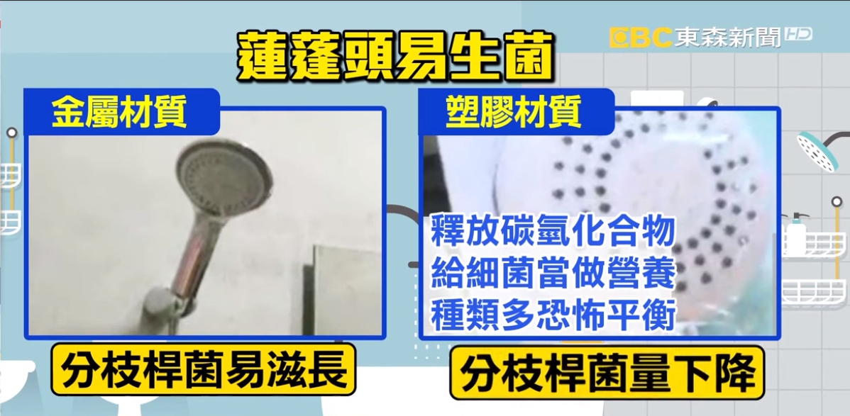 比起金屬材質,塑膠材質的蓮蓬頭會隨著時間老化,老化之後,塑膠材質就會放出很多的碳氫化合物,而這些碳氫化合物,可以給細菌當做營養,細菌種類變多的時候,反而有恐怖平衡,抑制分枝桿菌的量。