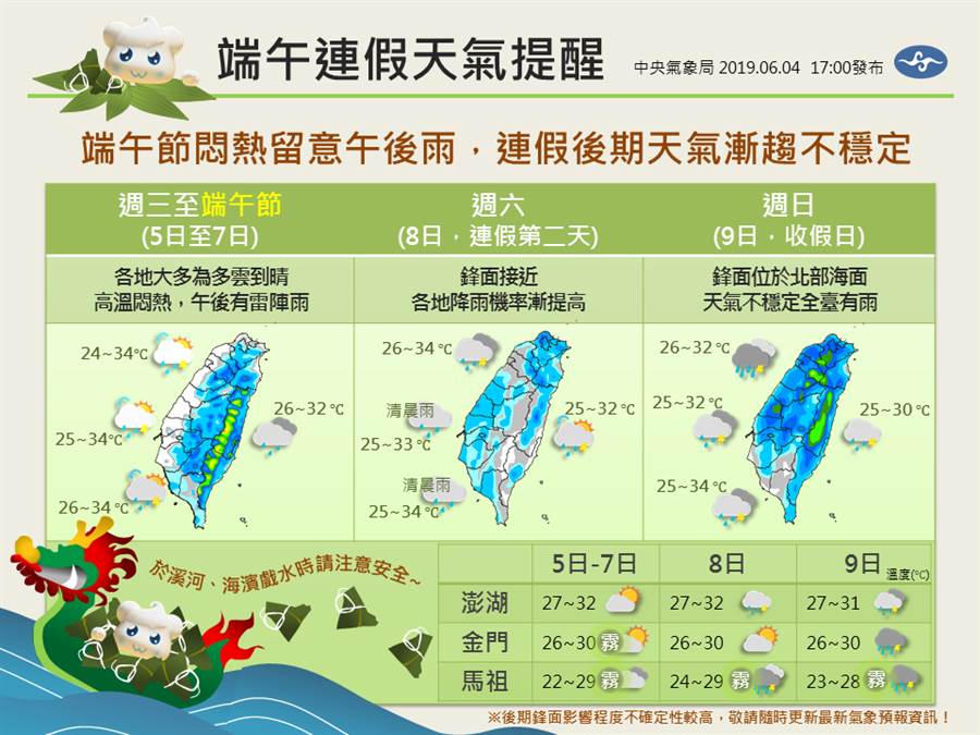 「報天氣-中央氣象局局」臉書粉絲團今天下午PO文指出,明天至端午節當天(5日至7日)受高壓影響,是為悶熱、多雲到晴的天氣,午後有局部雷陣雨;周六(8日)為天氣的轉變期,水氣逐漸增多、漸趨不穩定,到周日(9日)鋒面位於台灣北部海面,全台都有降雨的可能,雖然有空檔,但建議出門還是帶個傘備用!