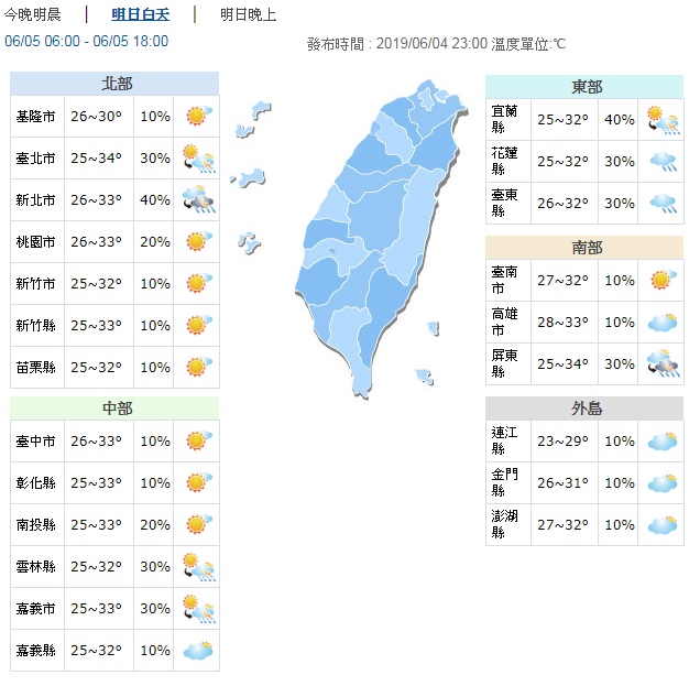中央氣象局預報,明(5日)受到太平洋高壓勢力增強影響,各地大多為多雲到晴的穩定天氣,僅花東地區有零星的短暫陣雨發生,其他地區則有局部短暫雷陣雨。氣象局稍早也PO圖顯示,端午節(7日)當天氣候悶熱,恐有午後雨來襲,連假後期則會變天,出現天氣不穩的狀態,出門多帶雨具以備不時之需!